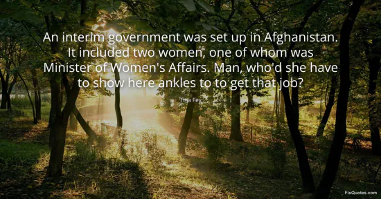 Fey, Tina. (2026, January 17). An interim government was set up in Afghanistan. It included two women, one of whom was Minister of Women's Affairs. Man, who'd she have to show here ankles to to get that job? FixQuotes. https://fixquotes.com/quotes/an-interim-government-was-set-up-in-afghanistan-63683/