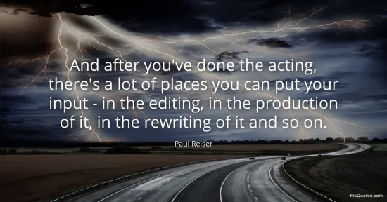 Reiser, Paul. "And after you've done the acting, there's a lot of places you can put your input - in the editing, in the production of it, in the rewriting of it and so on." FixQuotes. January 15, 2026. https://fixquotes.com/quotes/and-after-youve-done-the-acting-theres-a-lot-of-147390/.