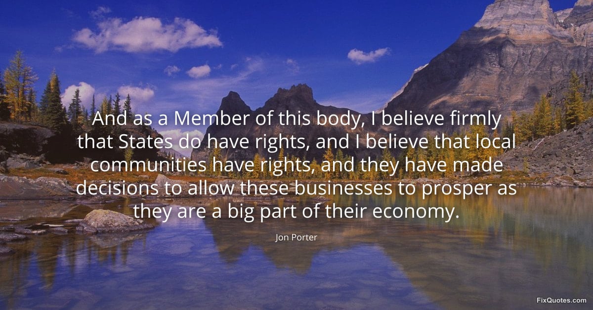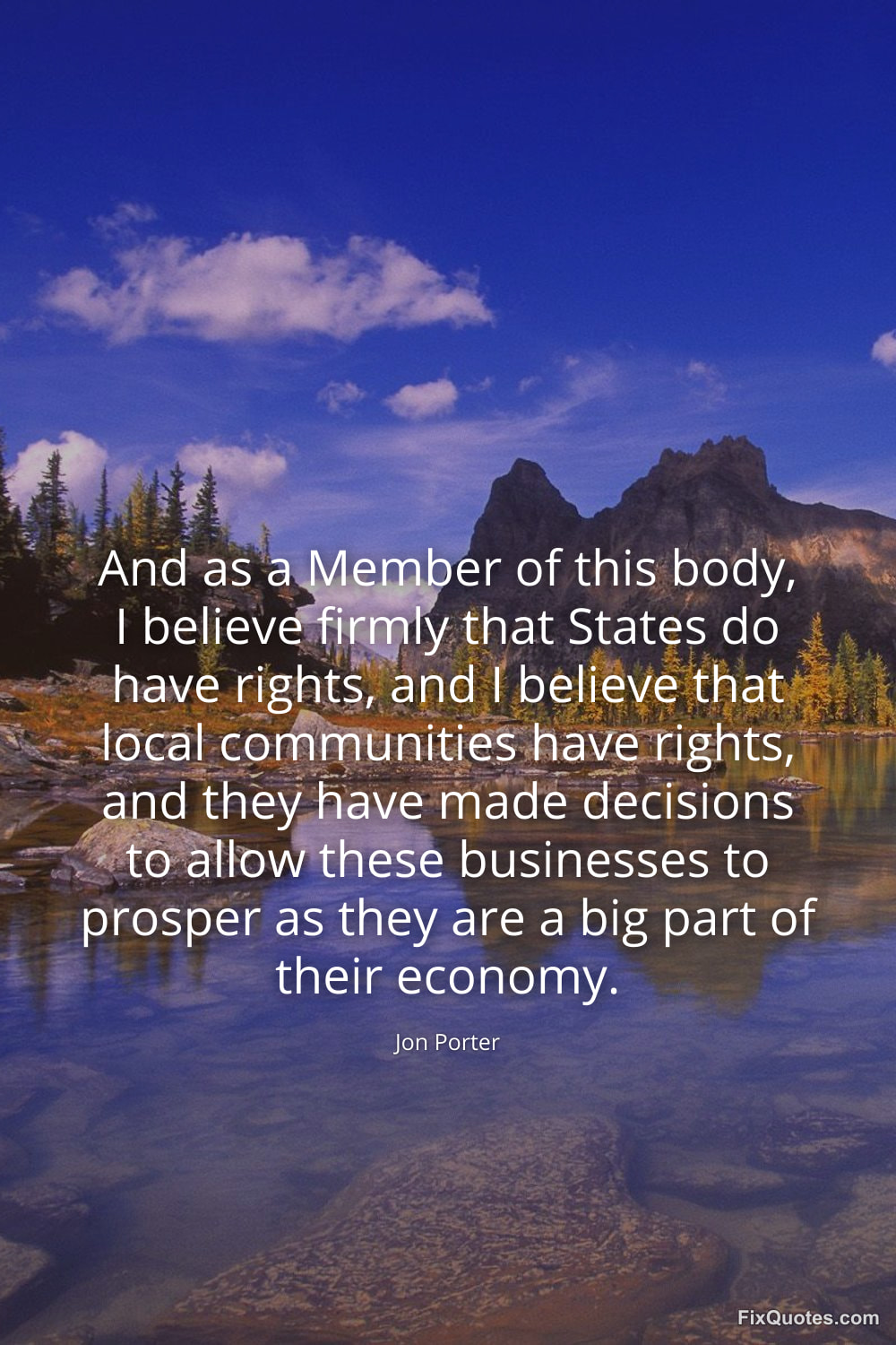 Porter, Jon. (2026, January 15). And as a Member of this body, I believe firmly that States do have rights, and I believe that local communities have rights, and they have made decisions to allow these businesses to prosper as they are a big part of their economy. FixQuotes. https://fixquotes.com/quotes/and-as-a-member-of-this-body-i-believe-firmly-151685/