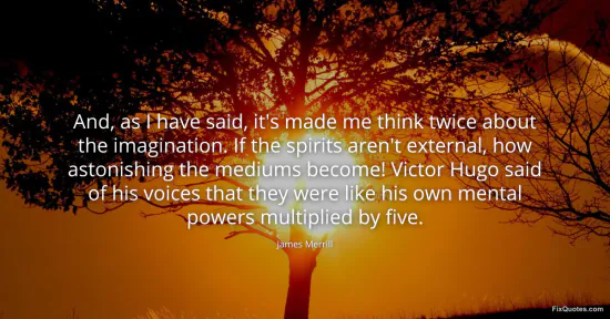 Merrill, James. "And, as I have said, it's made me think twice about the imagination. If the spirits aren't external, how astonishing the mediums become! Victor Hugo said of his voices that they were like his own mental powers multiplied by five." FixQuotes. January 15, 2026. https://fixquotes.com/quotes/and-as-i-have-said-its-made-me-think-twice-about-161847/.
