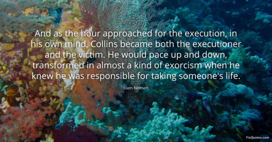 Neeson, Liam. "And as the hour approached for the execution, in his own mind, Collins became both the executioner and the victim. He would pace up and down, transformed in almost a kind of exorcism when he knew he was responsible for taking someone's life." FixQuotes. January 15, 2026. https://fixquotes.com/quotes/and-as-the-hour-approached-for-the-execution-in-153752/.