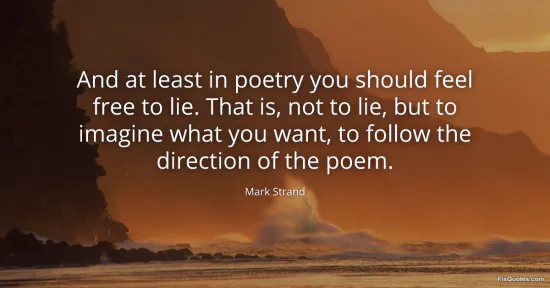 Strand, Mark. (2026, January 16). And at least in poetry you should feel free to lie. That is, not to lie, but to imagine what you want, to follow the direction of the poem. FixQuotes. https://fixquotes.com/quotes/and-at-least-in-poetry-you-should-feel-free-to-93292/