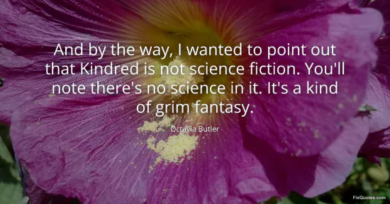 Butler, Octavia. "And by the way, I wanted to point out that Kindred is not science fiction. You'll note there's no science in it. It's a kind of grim fantasy." FixQuotes. January 15, 2026. https://fixquotes.com/quotes/and-by-the-way-i-wanted-to-point-out-that-kindred-165582/.