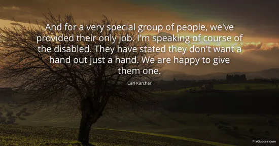 Karcher, Carl. "And for a very special group of people, we've provided their only job. I'm speaking of course of the disabled. They have stated they don't want a hand out just a hand. We are happy to give them one." FixQuotes. January 16, 2026. https://fixquotes.com/quotes/and-for-a-very-special-group-of-people-weve-125893/.