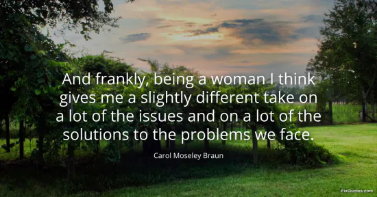 Braun, Carol Moseley. "And frankly, being a woman I think gives me a slightly different take on a lot of the issues and on a lot of the solutions to the problems we face." FixQuotes. January 17, 2026. https://fixquotes.com/quotes/and-frankly-being-a-woman-i-think-gives-me-a-42321/.