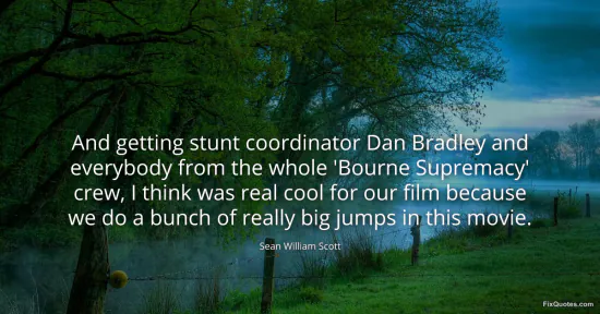 Scott, Sean William. "And getting stunt coordinator Dan Bradley and everybody from the whole 'Bourne Supremacy' crew, I think was real cool for our film because we do a bunch of really big jumps in this movie." FixQuotes. January 15, 2026. https://fixquotes.com/quotes/and-getting-stunt-coordinator-dan-bradley-and-157270/.