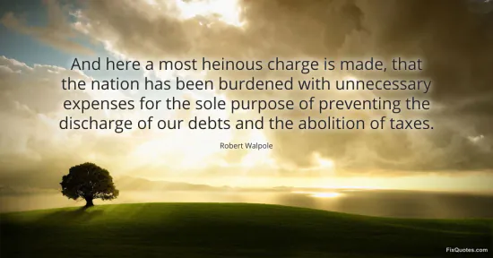 Walpole, Robert. "And here a most heinous charge is made, that the nation has been burdened with unnecessary expenses for the sole purpose of preventing the discharge of our debts and the abolition of taxes." FixQuotes. January 18, 2026. https://fixquotes.com/quotes/and-here-a-most-heinous-charge-is-made-that-the-4725/.