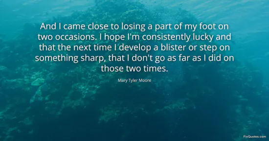 Moore, Mary Tyler. "And I came close to losing a part of my foot on two occasions. I hope I'm consistently lucky and that the next time I develop a blister or step on something sharp, that I don't go as far as I did on those two times." FixQuotes. January 15, 2026. https://fixquotes.com/quotes/and-i-came-close-to-losing-a-part-of-my-foot-on-155544/.