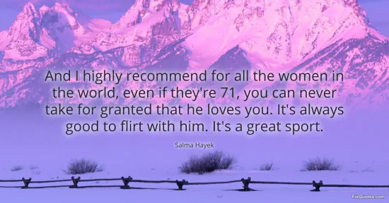 Hayek, Salma. "And I highly recommend for all the women in the world, even if they're 71, you can never take for granted that he loves you. It's always good to flirt with him. It's a great sport." FixQuotes. January 16, 2026. https://fixquotes.com/quotes/and-i-highly-recommend-for-all-the-women-in-the-107024/.