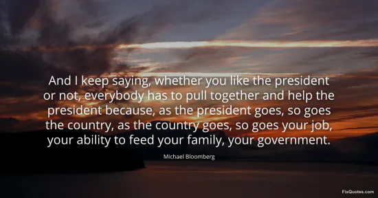 Bloomberg, Michael. "And I keep saying, whether you like the president or not, everybody has to pull together and help the president because, as the president goes, so goes the country, as the country goes, so goes your job, your ability to feed your family, your government." FixQuotes. January 16, 2026. https://fixquotes.com/quotes/and-i-keep-saying-whether-you-like-the-president-88733/.