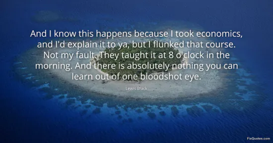 Black, Lewis. "And I know this happens because I took economics, and I'd explain it to ya, but I flunked that course. Not my fault. They taught it at 8 o'clock in the morning. And there is absolutely nothing you can learn out of one bloodshot eye." FixQuotes. January 15, 2026. https://fixquotes.com/quotes/and-i-know-this-happens-because-i-took-economics-148925/.