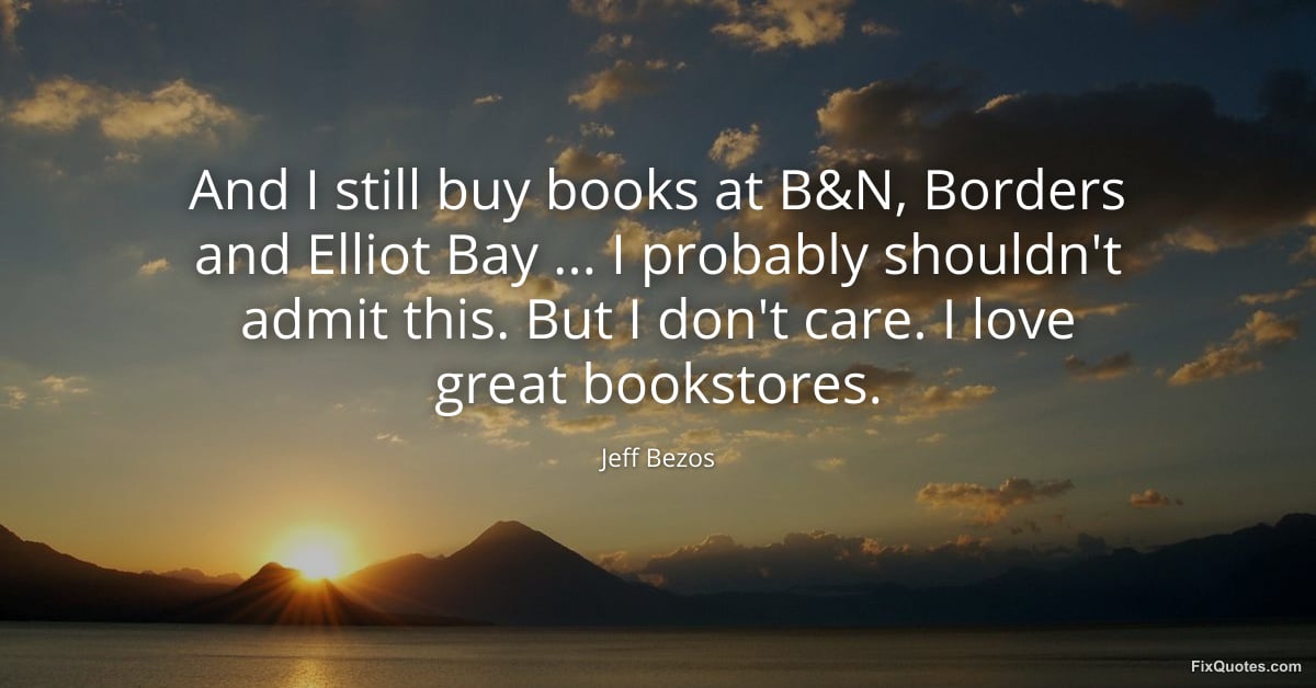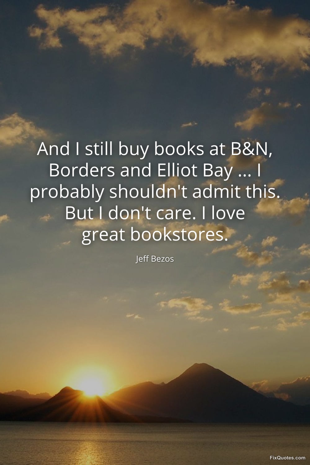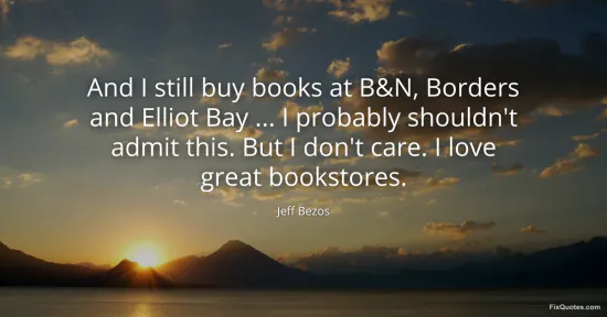 Bezos, Jeff. "And I still buy books at B&N, Borders and Elliot Bay ... I probably shouldn't admit this. But I don't care. I love great bookstores." FixQuotes. March 25, 2026. https://fixquotes.com/quotes/and-i-still-buy-books-at-bn-borders-and-elliot-186495/.