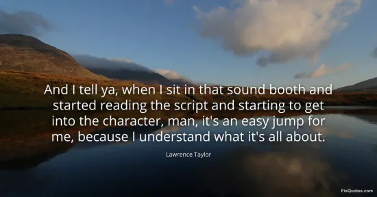 Taylor, Lawrence. (2026, January 16). And I tell ya, when I sit in that sound booth and started reading the script and starting to get into the character, man, it's an easy jump for me, because I understand what it's all about. FixQuotes. https://fixquotes.com/quotes/and-i-tell-ya-when-i-sit-in-that-sound-booth-and-102243/