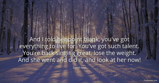 Gest, David. "And I told her point blank, you've got everything to live for. You've got such talent. You're back singing great, lose the weight. And she went and did it, and look at her now!" FixQuotes. January 16, 2026. https://fixquotes.com/quotes/and-i-told-her-point-blank-youve-got-everything-86681/.