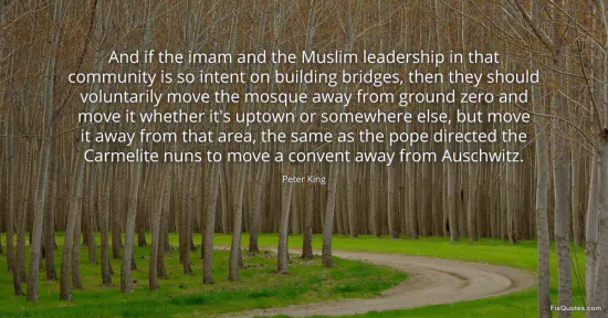 King, Peter. "And if the imam and the Muslim leadership in that community is so intent on building bridges, then they should voluntarily move the mosque away from ground zero and move it whether it's uptown or somewhere else, but move it away from that area, the same as the pope directed the Carmelite nuns to move a convent away from Auschwitz." FixQuotes. January 17, 2026. https://fixquotes.com/quotes/and-if-the-imam-and-the-muslim-leadership-in-that-57790/.