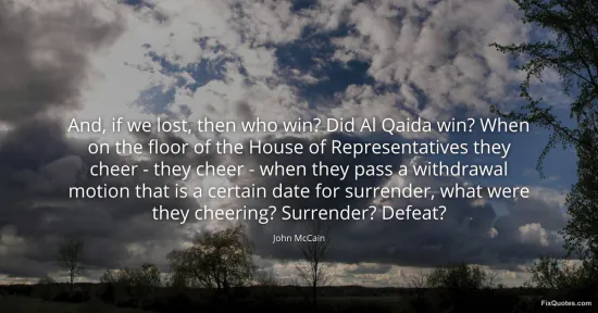 McCain, John. (2026, January 17). And, if we lost, then who win? Did Al Qaida win? When on the floor of the House of Representatives they cheer - they cheer - when they pass a withdrawal motion that is a certain date for surrender, what were they cheering? Surrender? Defeat? FixQuotes. https://fixquotes.com/quotes/and-if-we-lost-then-who-win-did-al-qaida-win-when-73185/