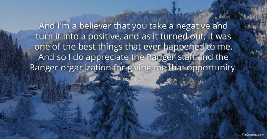 Ryan, Nolan. (2026, January 17). And I'm a believer that you take a negative and turn it into a positive, and as it turned out, it was one of the best things that ever happened to me. And so I do appreciate the Ranger staff and the Ranger organization for giving me that opportunity. FixQuotes. https://fixquotes.com/quotes/and-im-a-believer-that-you-take-a-negative-and-71653/