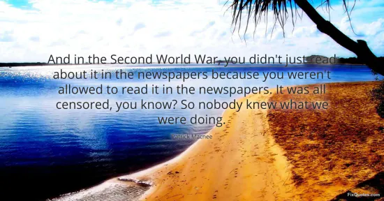 "And in the Second World War, you didn't just read about it in the newspapers because you weren't allowed to read it in the newspapers. It was all censored, you know? So nobody knew what we were doing." FixQuotes, 16 Jan. 2026, https://fixquotes.com/quotes/and-in-the-second-world-war-you-didnt-just-read-135754/. Accessed 13 Feb. 2026.
