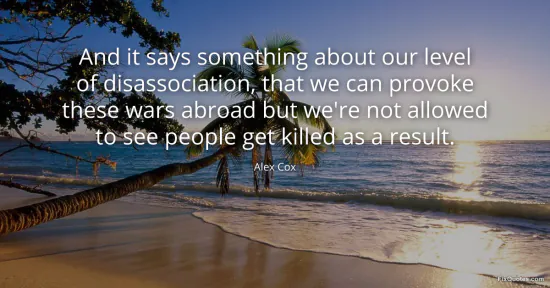 Cox, Alex. "And it says something about our level of disassociation, that we can provoke these wars abroad but we're not allowed to see people get killed as a result." FixQuotes. January 18, 2026. https://fixquotes.com/quotes/and-it-says-something-about-our-level-of-21970/.