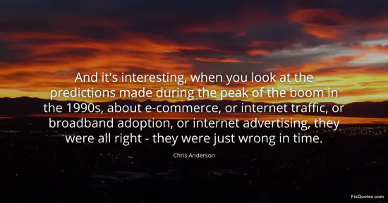 Anderson, Chris. "And it's interesting, when you look at the predictions made during the peak of the boom in the 1990s, about e-commerce, or internet traffic, or broadband adoption, or internet advertising, they were all right - they were just wrong in time." FixQuotes. January 15, 2026. https://fixquotes.com/quotes/and-its-interesting-when-you-look-at-the-157988/.