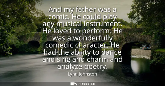 Lynn Johnston evokes a household where art and life blur, a home animated by a father who was not just funny but fundamentally performative. Calling him a comic who could play any instrument and loved to perform paints a portrait of range and fearlessness. The talents cascade: dancing, singing, charming, and, tellingly, analyzing poetry. That last detail reframes the picture. The stagecraft is not mere showiness; it is joined to a reflective, literary intelligence that studies rhythm, structure, and meaning.