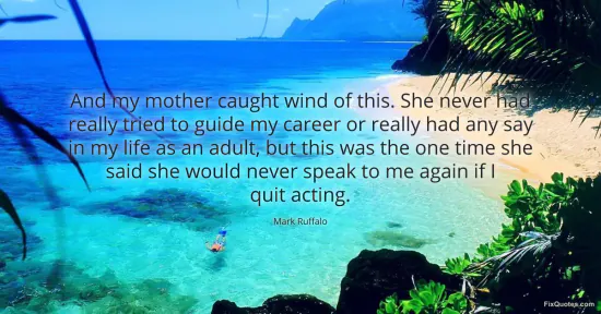 Ruffalo, Mark. "And my mother caught wind of this. She never had really tried to guide my career or really had any say in my life as an adult, but this was the one time she said she would never speak to me again if I quit acting." FixQuotes. January 15, 2026. https://fixquotes.com/quotes/and-my-mother-caught-wind-of-this-she-never-had-166257/.