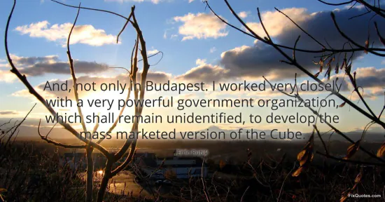 "And, not only in Budapest. I worked very closely with a very powerful government organization, which shall remain unidentified, to develop the mass marketed version of the Cube." FixQuotes, 15 Jan. 2026, https://fixquotes.com/quotes/and-not-only-in-budapest-i-worked-very-closely-148027/. Accessed 12 Feb. 2026.