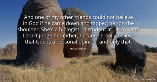 Tamblyn, Amber. (2026, January 17). And one of my other friends could not believe in God if he came down and tapped her on the shoulder. She's a biologist - a student at UCLA - and I don't judge her either, because I really believe that God is a personal opinion, and only that. FixQuotes. https://fixquotes.com/quotes/and-one-of-my-other-friends-could-not-believe-in-42989/
