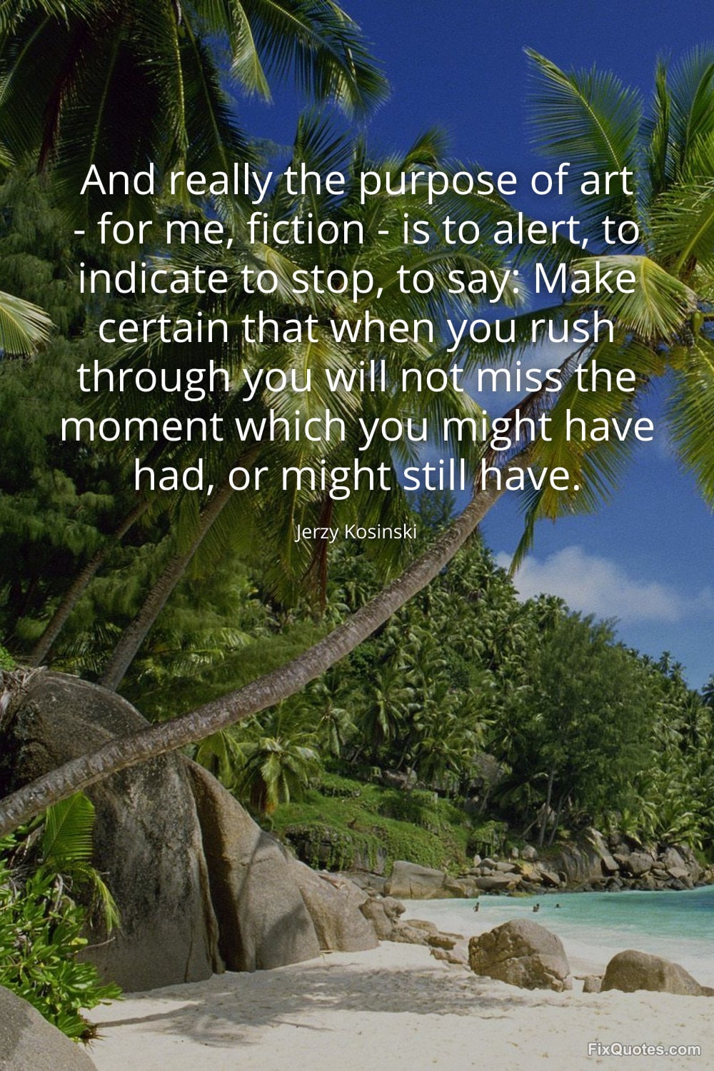 Kosinski, Jerzy. (2026, January 15). And really the purpose of art - for me, fiction - is to alert, to indicate to stop, to say: Make certain that when you rush through you will not miss the moment which you might have had, or might still have. FixQuotes. https://fixquotes.com/quotes/and-really-the-purpose-of-art-for-me-fiction-145942/