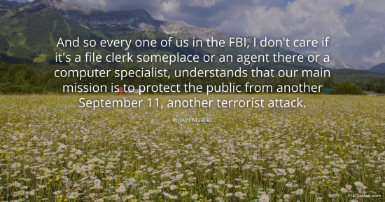 Mueller, Robert. (2026, January 16). And so every one of us in the FBI, I don't care if it's a file clerk someplace or an agent there or a computer specialist, understands that our main mission is to protect the public from another September 11, another terrorist attack. FixQuotes. https://fixquotes.com/quotes/and-so-every-one-of-us-in-the-fbi-i-dont-care-if-105933/