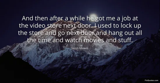 Mewes, Jason. "And then after a while he got me a job at the video store next door. I used to lock up the store and go next door and hang out all the time and watch movies and stuff." FixQuotes. January 15, 2026. https://fixquotes.com/quotes/and-then-after-a-while-he-got-me-a-job-at-the-146936/.