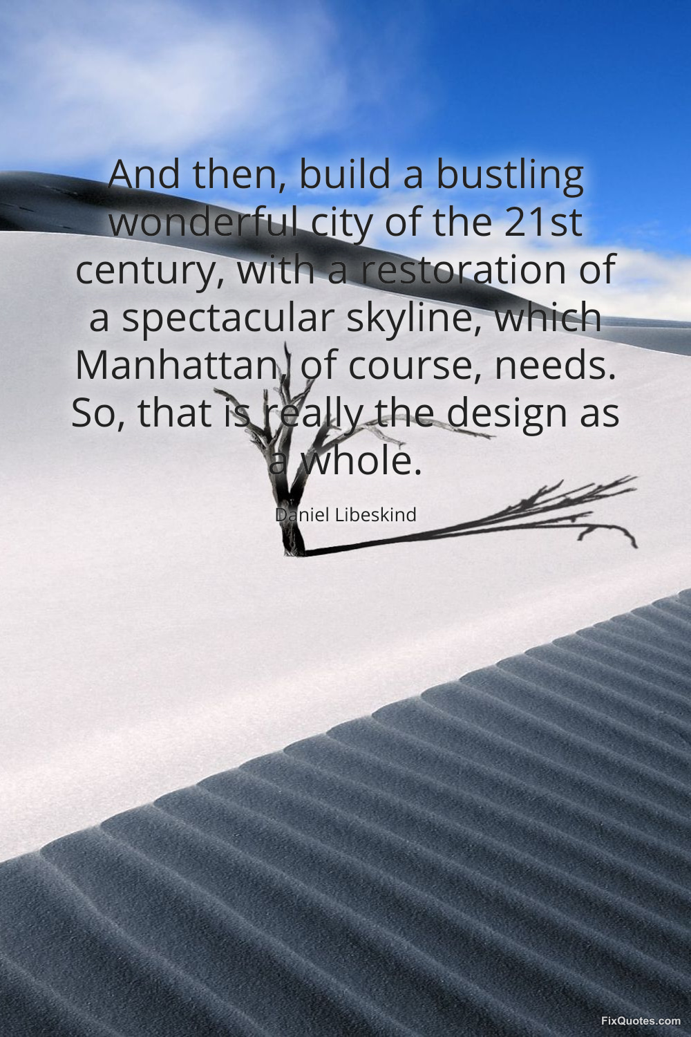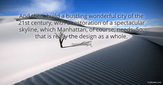 Libeskind, Daniel. (2026, January 17). And then, build a bustling wonderful city of the 21st century, with a restoration of a spectacular skyline, which Manhattan, of course, needs. So, that is really the design as a whole. FixQuotes. https://fixquotes.com/quotes/and-then-build-a-bustling-wonderful-city-of-the-64989/