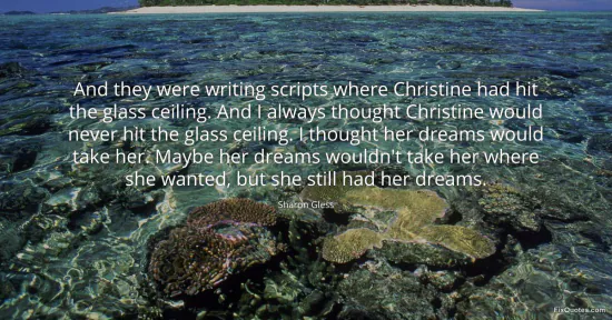 Gless, Sharon. "And they were writing scripts where Christine had hit the glass ceiling. And I always thought Christine would never hit the glass ceiling. I thought her dreams would take her. Maybe her dreams wouldn't take her where she wanted, but she still had her dreams." FixQuotes. January 15, 2026. https://fixquotes.com/quotes/and-they-were-writing-scripts-where-christine-had-154130/.