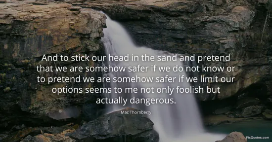 Thornberry, Mac. (2026, January 16). And to stick our head in the sand and pretend that we are somehow safer if we do not know or to pretend we are somehow safer if we limit our options seems to me not only foolish but actually dangerous. FixQuotes. https://fixquotes.com/quotes/and-to-stick-our-head-in-the-sand-and-pretend-103840/