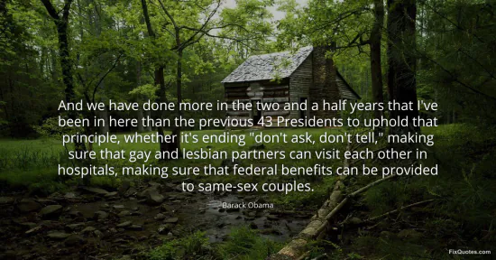 Obama, Barack. (2026, January 17). And we have done more in the two and a half years that I've been in here than the previous 43 Presidents to uphold that principle, whether it's ending "don't ask, don't tell," making sure that gay and lesbian partners can visit each other in hospitals, making sure that federal benefits can be provided to same-sex couples. FixQuotes. https://fixquotes.com/quotes/and-we-have-done-more-in-the-two-and-a-half-years-25218/