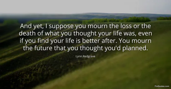 Redgrave, Lynn. (2026, January 16). And yet, I suppose you mourn the loss or the death of what you thought your life was, even if you find your life is better after. You mourn the future that you thought you'd planned. FixQuotes. https://fixquotes.com/quotes/and-yet-i-suppose-you-mourn-the-loss-or-the-death-104482/