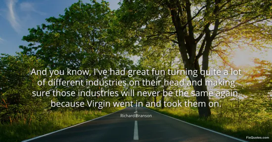 "And you know, I've had great fun turning quite a lot of different industries on their head and making sure those industries will never be the same again, because Virgin went in and took them on." FixQuotes, 18 Jan. 2026, https://fixquotes.com/quotes/and-you-know-ive-had-great-fun-turning-quite-a-1353/. Accessed 12 Feb. 2026.