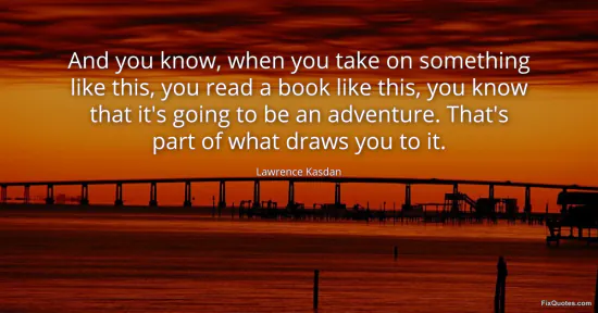 Kasdan, Lawrence. (2026, January 16). And you know, when you take on something like this, you read a book like this, you know that it's going to be an adventure. That's part of what draws you to it. FixQuotes. https://fixquotes.com/quotes/and-you-know-when-you-take-on-something-like-this-92173/
