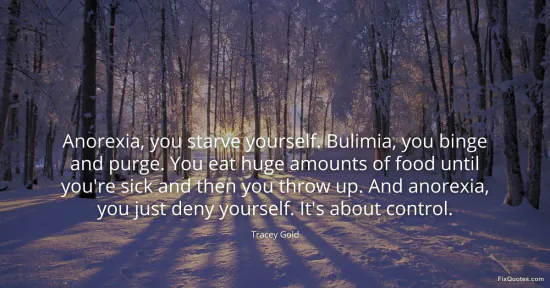 Gold, Tracey. "Anorexia, you starve yourself. Bulimia, you binge and purge. You eat huge amounts of food until you're sick and then you throw up. And anorexia, you just deny yourself. It's about control." FixQuotes. January 15, 2026. https://fixquotes.com/quotes/anorexia-you-starve-yourself-bulimia-you-binge-145480/.