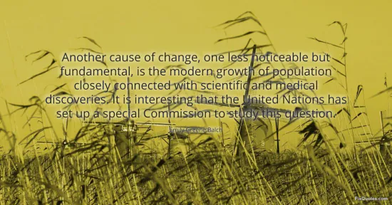 Balch, Emily Greene. "Another cause of change, one less noticeable but fundamental, is the modern growth of population closely connected with scientific and medical discoveries. It is interesting that the United Nations has set up a special Commission to study this question." FixQuotes. January 17, 2026. https://fixquotes.com/quotes/another-cause-of-change-one-less-noticeable-but-74344/.