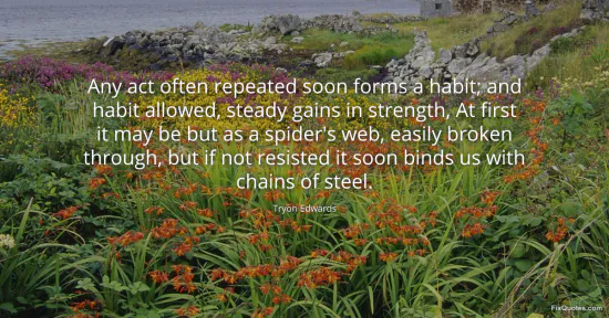 Edwards, Tryon. "Any act often repeated soon forms a habit; and habit allowed, steady gains in strength, At first it may be but as a spider's web, easily broken through, but if not resisted it soon binds us with chains of steel." FixQuotes. January 18, 2026. https://fixquotes.com/quotes/any-act-often-repeated-soon-forms-a-habit-and-9781/.