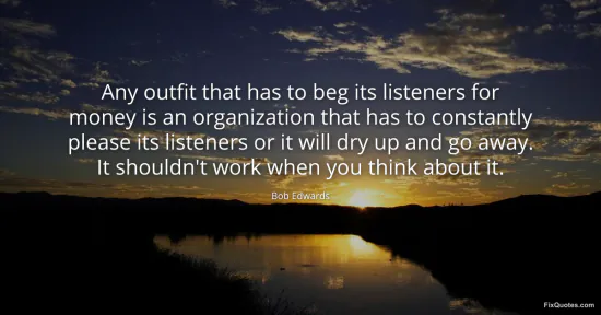 Edwards, Bob. "Any outfit that has to beg its listeners for money is an organization that has to constantly please its listeners or it will dry up and go away. It shouldn't work when you think about it." FixQuotes. January 17, 2026. https://fixquotes.com/quotes/any-outfit-that-has-to-beg-its-listeners-for-46109/.
