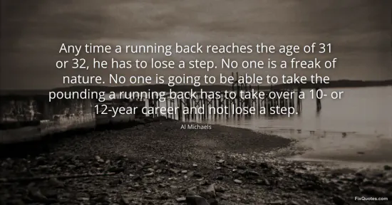 Michaels, Al. "Any time a running back reaches the age of 31 or 32, he has to lose a step. No one is a freak of nature. No one is going to be able to take the pounding a running back has to take over a 10- or 12-year career and not lose a step." FixQuotes. January 17, 2026. https://fixquotes.com/quotes/any-time-a-running-back-reaches-the-age-of-31-or-43707/.