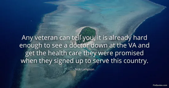 Lampson, Nick. "Any veteran can tell you, it is already hard enough to see a doctor down at the VA and get the health care they were promised when they signed up to serve this country." FixQuotes. February 18, 2026. https://fixquotes.com/quotes/any-veteran-can-tell-you-it-is-already-hard-57179/.
