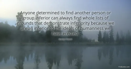 "Anyone determined to find another person or group inferior can always find whole lists of grounds that demonstrate inferiority because we are all inferior to the ideals of humanness we have erected." FixQuotes, 17 Jan. 2026, https://fixquotes.com/quotes/anyone-determined-to-find-another-person-or-group-69504/. Accessed 11 Feb. 2026.