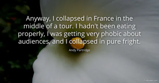 Partridge, Andy. "Anyway, I collapsed in France in the middle of a tour. I hadn't been eating properly, I was getting very phobic about audiences, and I collapsed in pure fright." FixQuotes. January 17, 2026. https://fixquotes.com/quotes/anyway-i-collapsed-in-france-in-the-middle-of-a-43906/.