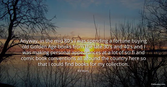 Mumy, Bill. "Anyway, in the mid 80's I was spending a fortune buying old Golden Age books from the late 30's and 40's and I was making personal appearances at a lot of sci fi and comic book conventions all around the country here so that I could find books for my collection." FixQuotes. January 16, 2026. https://fixquotes.com/quotes/anyway-in-the-mid-80s-i-was-spending-a-fortune-139643/.