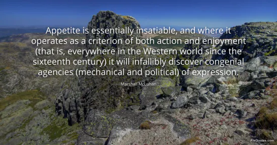 McLuhan, Marshall. "Appetite is essentially insatiable, and where it operates as a criterion of both action and enjoyment (that is, everywhere in the Western world since the sixteenth century) it will infallibly discover congenial agencies (mechanical and political) of expression." FixQuotes. January 18, 2026. https://fixquotes.com/quotes/appetite-is-essentially-insatiable-and-where-it-748/.