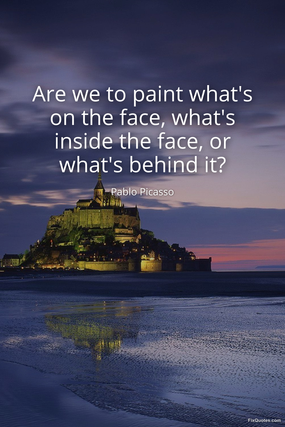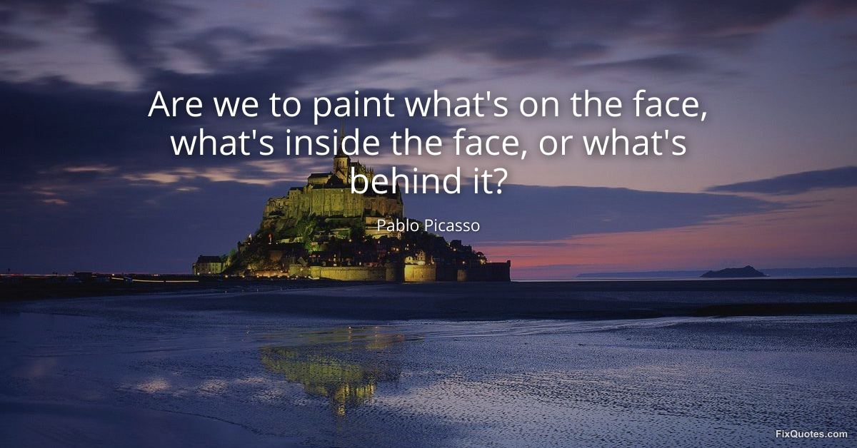 Picasso, Pablo. (2026, January 15). Are we to paint what's on the face, what's inside the face, or what's behind it? FixQuotes. https://fixquotes.com/quotes/are-we-to-paint-whats-on-the-face-whats-inside-14860/