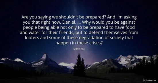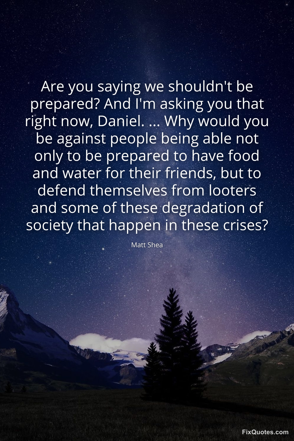 Shea, Matt. (2026, February 9). Are you saying we shouldn't be prepared? And I'm asking you that right now, Daniel. ... Why would you be against people being able not only to be prepared to have food and water for their friends, but to defend themselves from looters and some of these degradation of society that happen in these crises? FixQuotes. https://fixquotes.com/quotes/are-you-saying-we-shouldnt-be-prepared-and-im-185014/